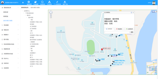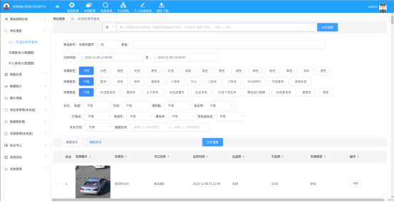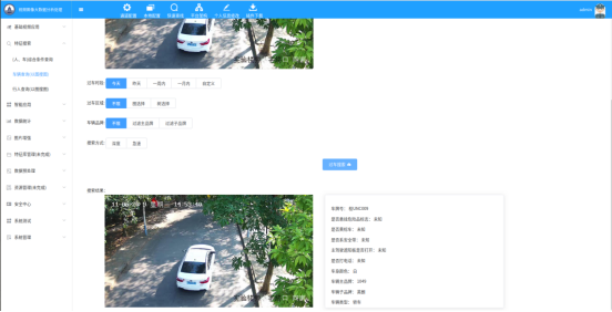 平台连接着每个摄像头,具有视频的实时观看和回放查看等基础功能,对于摄像头的位置、存在状态也有实时的监控并能及时反馈在页面上。平台的智能分析模块,能够根据车辆的外观属性通过视频资源分析的结果查找符合条件的车辆信息。通过对车辆图片或行人的图片的分析,平台可以分析出该目标的详细属性信息。通过车牌号和时间的搜索,平台也可以模拟并生成车辆的行驶轨迹。平台将所有摄像头产生的视频资源分析并整合,形成车流量统计和过车数据分析等概括性的数据反馈。