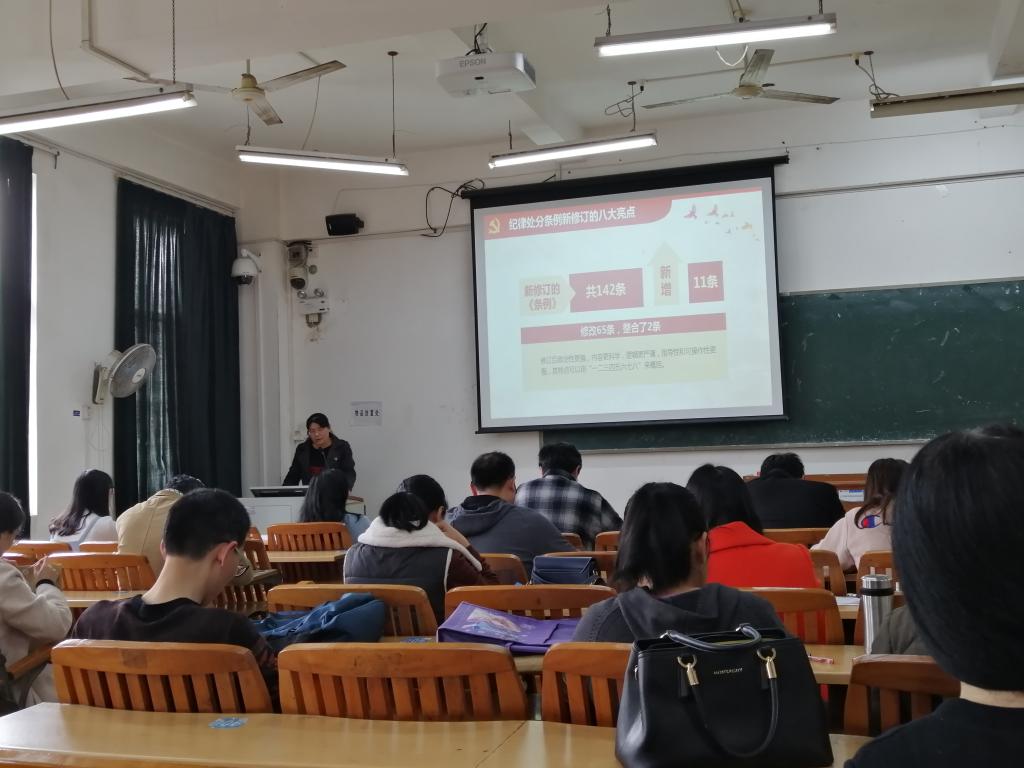 会议由教师党支部书记苏芳同志主持,会议上全体党员同志集中学习了《中国共产党纪律处分条例》,明确《条例》的重要作用,其中重点提及纪律处分条例新增部分,希望党员同志认真学习,加强党支部标准化规范化建设。随后学习了《中国共产党支部工作条例》,了解条例出台的背景和意义,认真学习党支部八大基本任务,认真落实“党员活动日”制度,规范“三会一课”、组织生活会、党课、主题党日、民主评议党员、谈心谈话等基本制度。本次会议还学习了宣传贯彻习近平总书记“建设壮美广西 共圆复兴梦想”重要题词精神,深刻领会习近平总书记重要题词的深刻内涵和重大意义,并观看了远程教育必修课视频----八桂讲堂:《广西壮族自治区成立60周年社会发展成就》。观看结束后,支部书记鼓励支部党员在平时的空闲时间,可以继续通过学习强国APP、“八桂先锋”网站等平台开展自学,将党员的经常性教育工作落至实际工作中去,不断提高个人政治素养,促进支部党组织凝聚力不断提升。