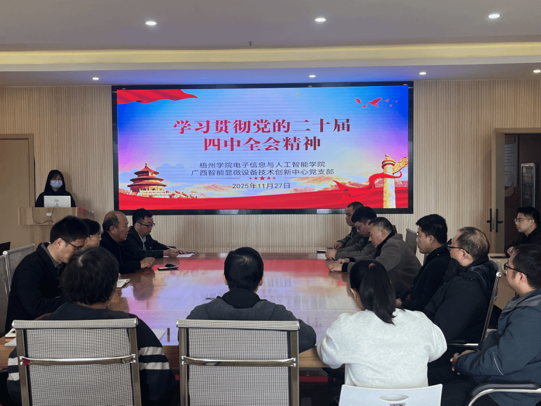 为深入学习贯彻党的二十届四中全会精神,推动基层党务工作与科研创新深度融合,2025年11月27日下午,广西智能显微设备技术创新中心党支部在明科楼K902会议室开展“深入学习贯彻党的二十届四中全会精神,讨论支部建设思路”主题党日活动。活动以政治建设为引领,突出“学、思、行”结合,为支部建设锚定方向、凝聚共识。