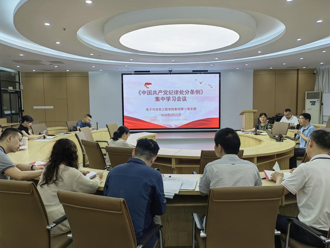 根据学校党委印发的《关于在全校开展党纪学习教育的实施方案》通知要求,为落实电子与信息工程学院党委关于党纪学习教育部署会议精神,推进党纪学习教育走深走实,电子与信息工程学院教师第一党支部5月22日在明科楼K1108召开《中国共产党纪律处分条例》专题学习会议,会议由支部书记姚高华主持,教师第一党支部全体党员参加。