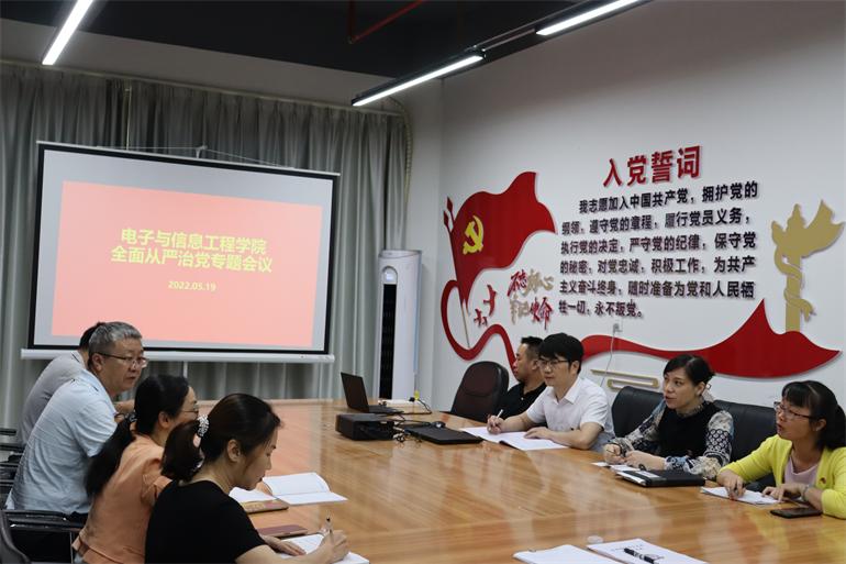 5月19日下午,电子与信息工程学院在科技楼1204会议室召开全面从严治党专题会议,学院党委书记邓小林主持会议,学院全体领导班子、党政办公室主任和副主任、组织员、团委书记、教师党支部书记、实验室主任参加会议。