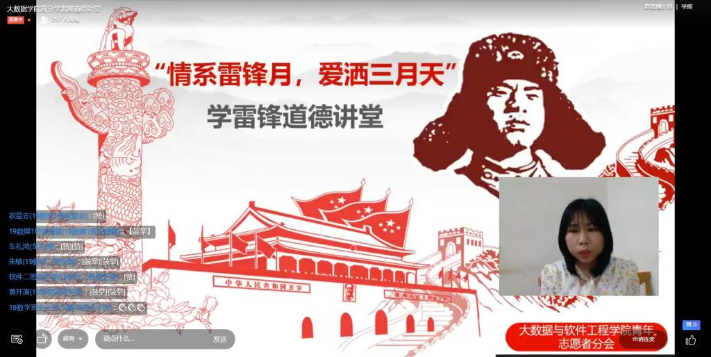3月21日晚,大数据与软件工程学院开展线上“情系雷锋月,爱洒三月天”道德讲堂。团委副书记书朱晓芹老师、青委员吴欣桦老师及各班学生代表参加了本次活动。