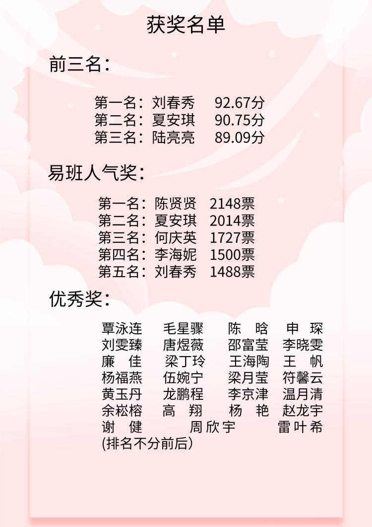 经过网上投票及评委老师根据评分细则进行严格评审,最终19学前教育中职升本2班刘春秀获一等奖、19新闻学1班夏安琪获二等奖、19会计专科2班陆亮亮获三等奖陈贤贤等5名同学获“最佳网络人气奖”,覃泳连等28名同学获优秀奖。