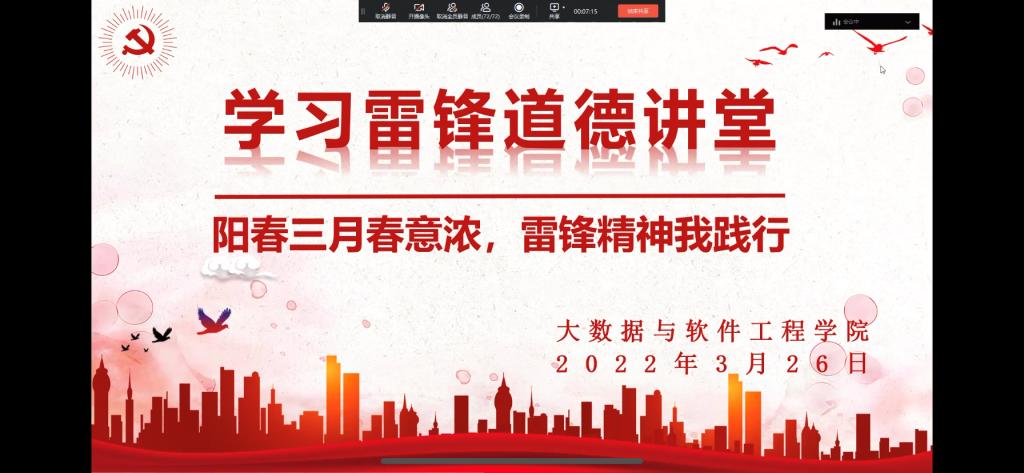 为弘扬雷锋精神,进一步加强青年大学生思想道德建设,大数据与软件工程学院于3月26日晚在线上开展主题为“阳春三月春意浓,雷锋精神我践行”学习雷锋道德讲堂活动。学院党委副书记韦翠兰老师、团委副书记朱晓芹老师以及青年志愿者分会全体成员参加本次活动。
