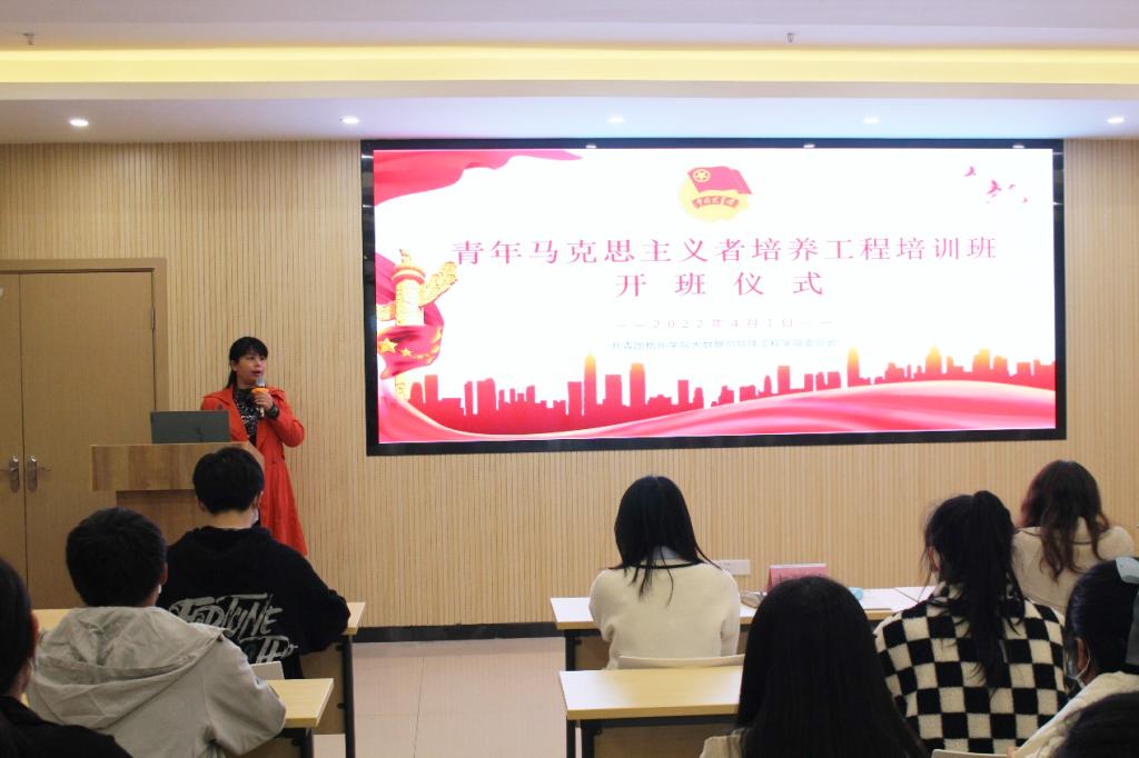 为深入引导青年学生骨干增强政治素质、提升思想境界、锤炼品格作风,大数据与软件工程学院于4月1日在明科楼K902举行2022年“青年马克思主义者培养工程”培训班开班仪式,学院党委副书记韦翠兰老师、团委副书记朱晓芹老师、青年委员李秀瑜老师及本期培训班全体学员参加开班仪式。