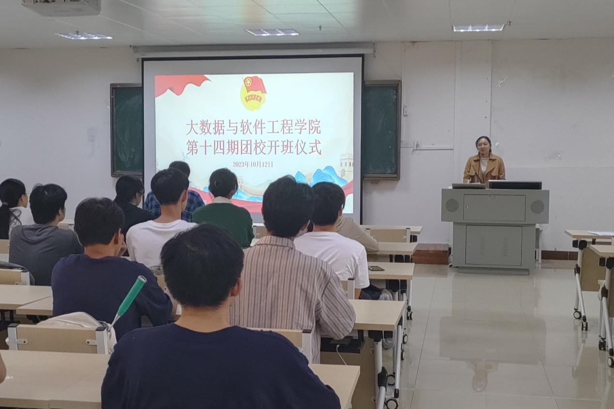 为充分发挥共青团育人作用,进一步加强对青年大学生的思想政治引领,10月12日晚,大数据与软件工程学院在明科楼k307举行第十四期团校开班仪式,学院党委副书记陈春潮老师、学院团委青年委员胡晓娟老师及本期培训班全体学员参加本次开班仪式。