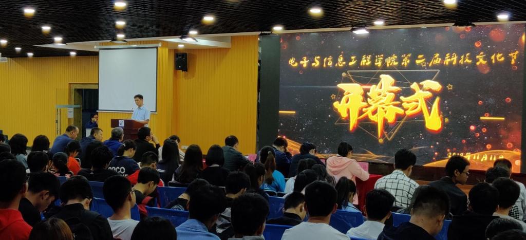 11月11日晚,电子与信息工程学院在大学生综合发展中心举行电信学院第二届“科技文化节”开幕仪式。学院领导、教研室主任、教师代表以及约180名学生代表参加参加了本次开幕式。