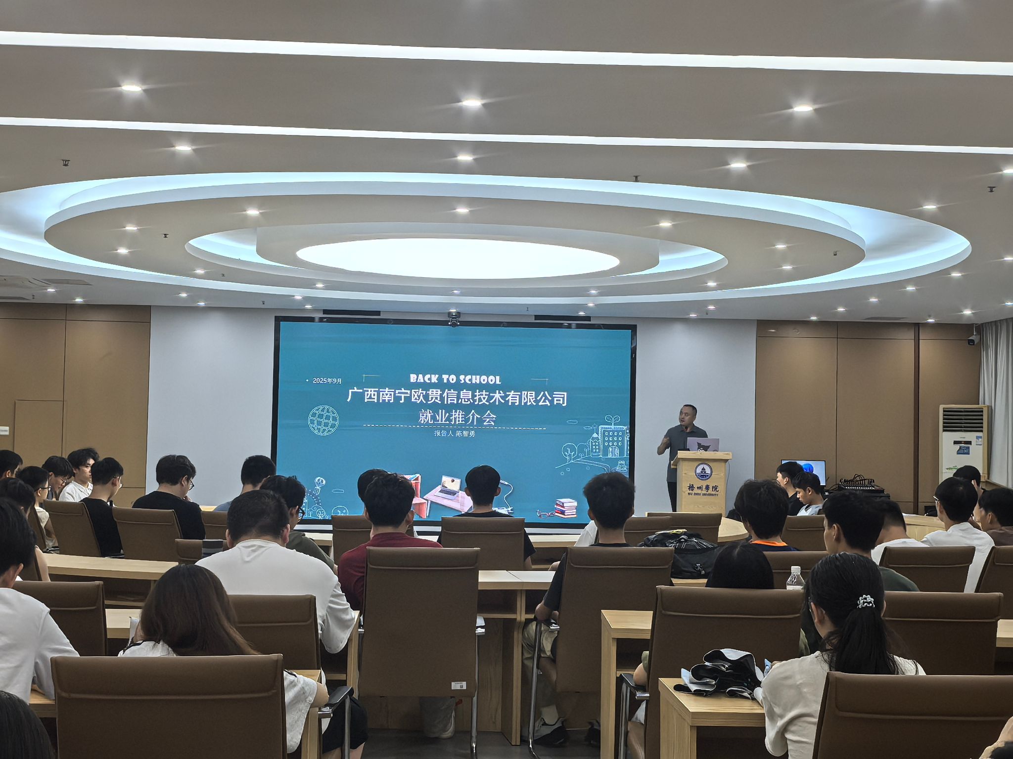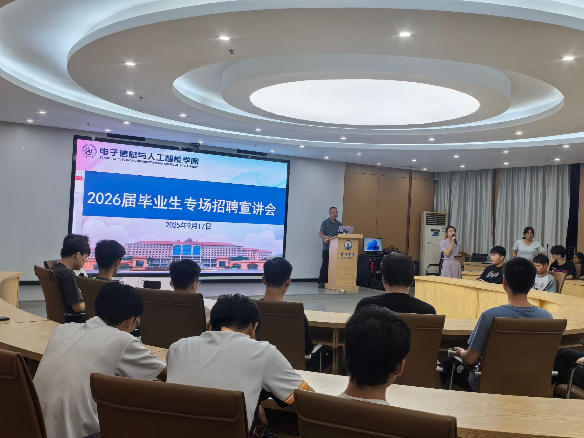 2025年9月17日,电子信息与人工智能学院联合广西南宁欧贯信息技术有限公司在明科楼1108室成功举办了就业指导讲座暨专场招聘宣讲会,电子信息工程、计算机科学与技术专业的2026届毕业生参加了本次宣讲会。