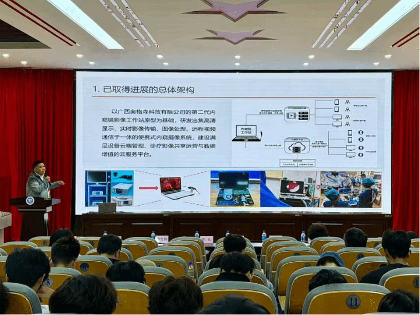 许才顼以《便携式远程高清内窥摄像系统关键技术研发及其产业化》为题,介绍了联合广西奥格森科技有限公司开展产学研合作的详细情况。