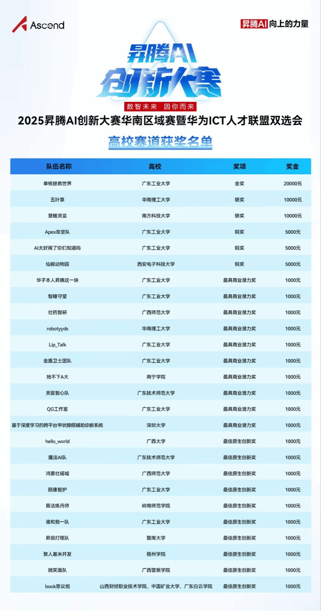昇腾AI创新大赛是面向AI开发者打造的顶级赛事,旨在鼓励全产业开发者基于昇腾AI技术和产品,打造软/硬件解决方案、探索模型算法,加速AI与行业融合,促进开发者能力提升。2025年,大赛全面升级,由广东、广西、海南三地将组成华南赛区,以“数智未来,因你而来”为主题,联合三地开发者群体,让人工智能技术突破实验室范畴,共同推动人工智能产业应用规模化发展,引领新一轮人工智能产业未来。