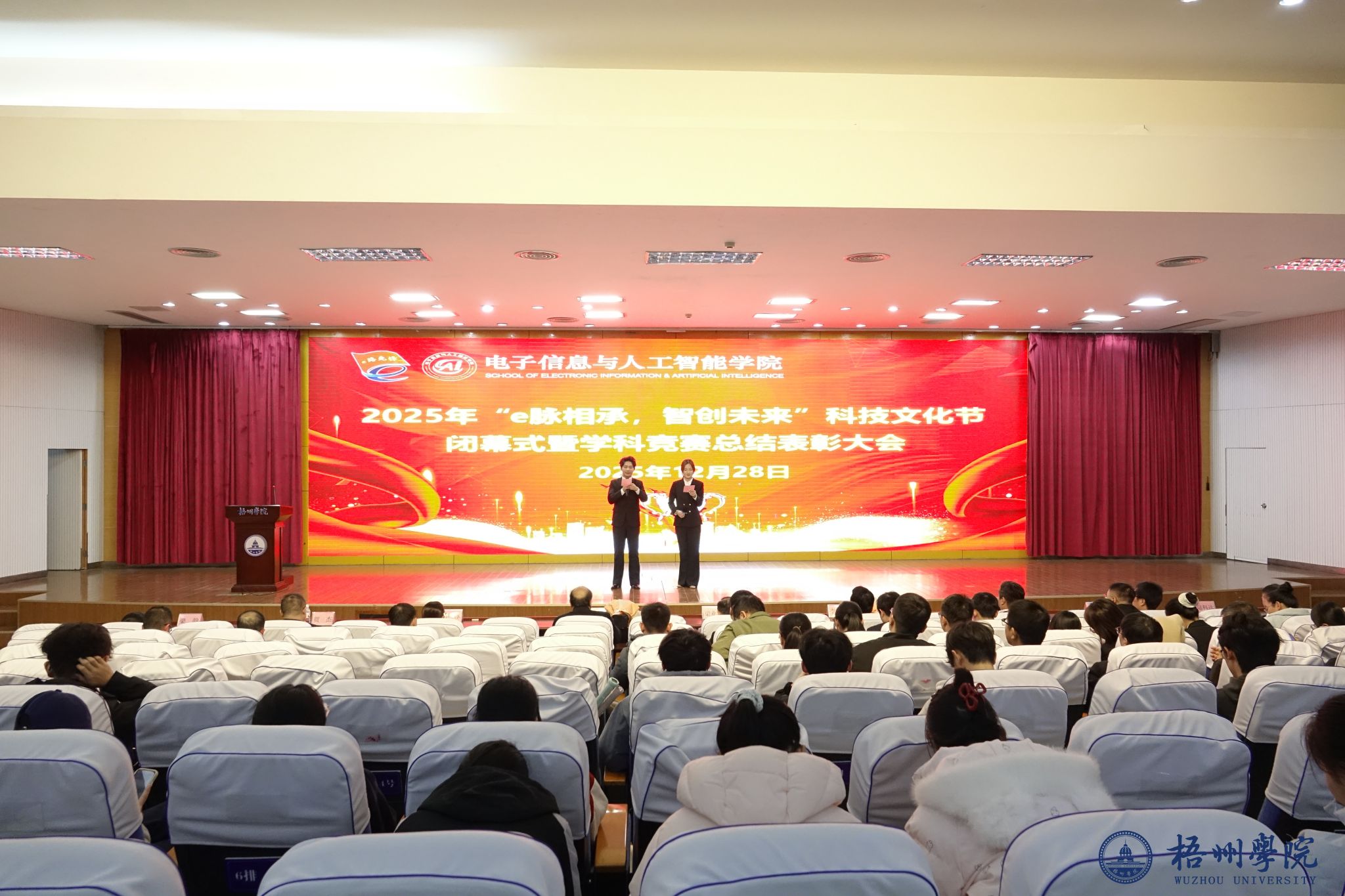 12月28日晚,电子信息与人工智能学院在明理楼报告厅举办2025“e脉相承,智创未来”科技文化节闭幕式暨学科竞赛表彰大会。学校党委副书记梁业华、广西机器视觉与智能控制重点实验室主任玉振明、学校学生工作部部长李德华、学院全体领导及获奖教师代表、获奖学生代表出席活动。