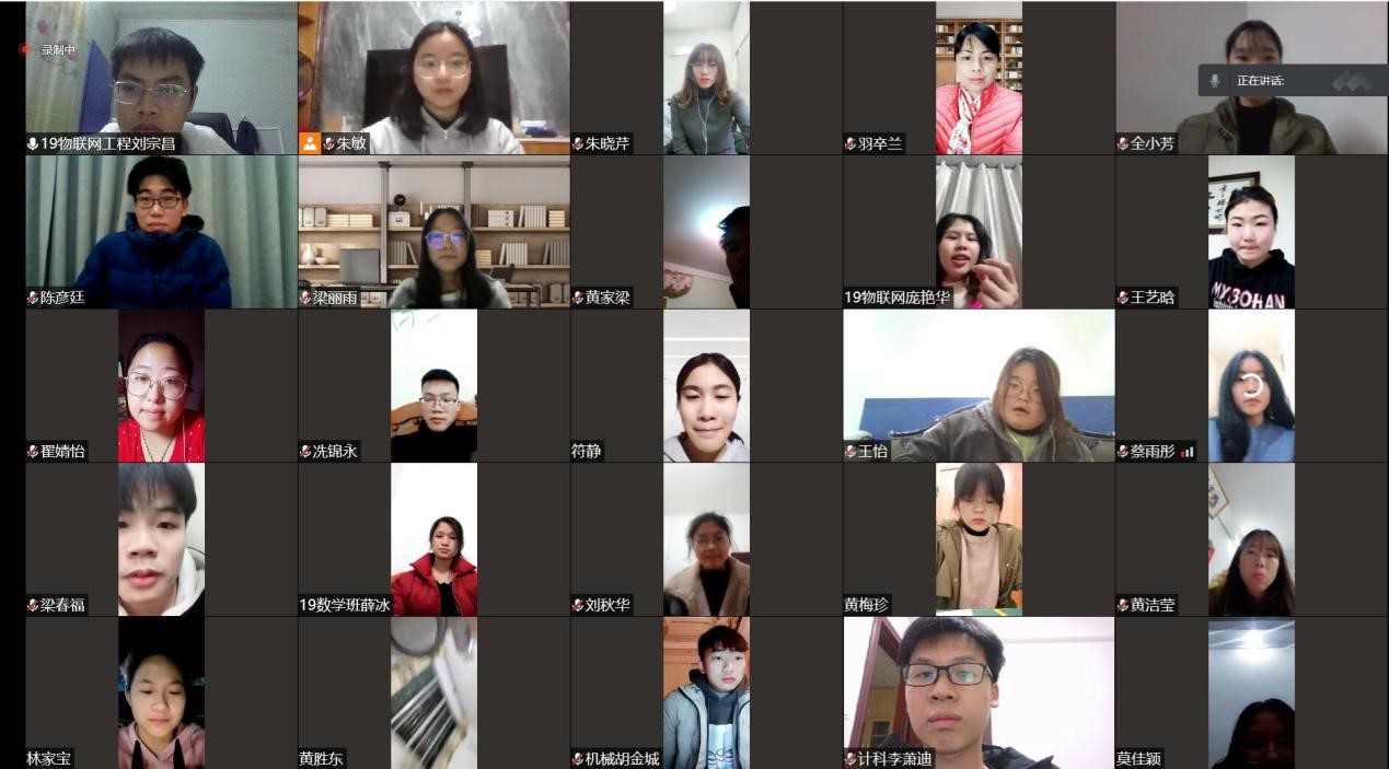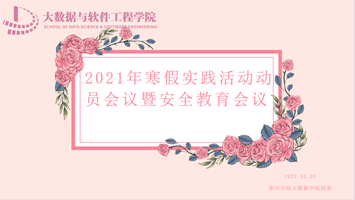 为了进一步深入贯彻落实校团委《关于组织开展梧州学院2021年大学生寒假实践活动》的要求,大数据学院于1月20日晚在线上召开2021年寒假“返家乡”社会实践活动动员会暨安全教育会议,学院党委副书记韦翠兰、团委副书记朱晓芹及参加本次社会实践活动的全体成员出席会议。