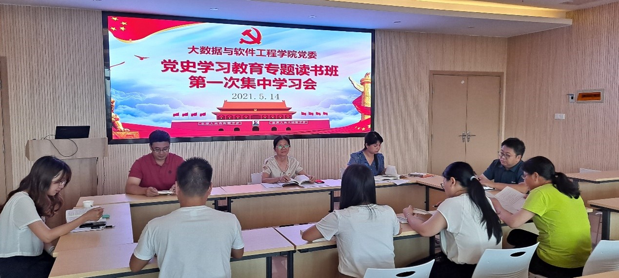 为坚持读原著、学原文、悟原理,推进党史学习教育入脑入心,5月14日,大数据与软件工程学院党委开展党史学习教育读书班第一次集中学习,学院党委委员、党政办主任、党支部书记、团委副书记参加学习。