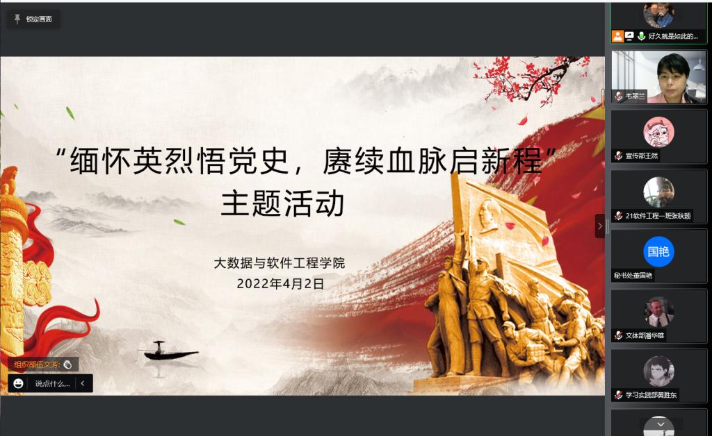 清明时节,哀思无限。为纪念革命先烈,传承红色基因,大数据与软件工程学院于4月2日下午在线上开展“缅怀英烈悟党史,赓续血脉启新程”主题活动,学院党委副书记韦翠兰老师、团委副书记朱晓芹老师以及学院团委·学生会全体成员参加本次活动。