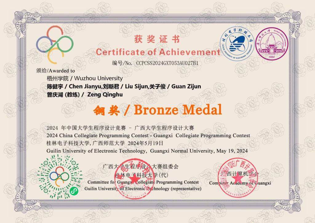 近日,2024第七届广西大学生程序设计大赛在广西桂林市广西师范大学落下帷幕,大数据与软件工程学院的参赛队伍表现出色,获得省级三等奖1项。
