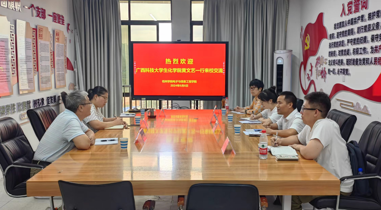 6月6日下午,广西科技大学生物与化学工程院黄文艺副院长一行到电子与信息工程学院调研交流。电子与信息工程学院院长张文祥、发展规划处副处长龚平等热情接待了黄文艺一行。双方在明科楼1204室开展交流座谈会。