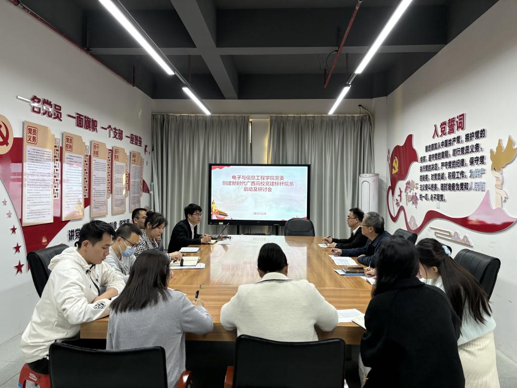 根据《自治区党委教育工委关于公布第二批新时代广西高校党建示范创建和质量创优工作培育创建单位名单的通知》(桂教工委组〔2023〕51号),梧州学院电子与信息工程学院党委入选第二批新时代广西高校党建工作标杆院系培育创建单位,为了更好的加强和促进标杆院系的建设工作,12月9日下午,电子与信息工程学院在1204室召开创建新时代广西高校党建标杆院系启动及研讨会,学院全体领导班子、科级以上领导干部以及基层党支部书记参加会议。