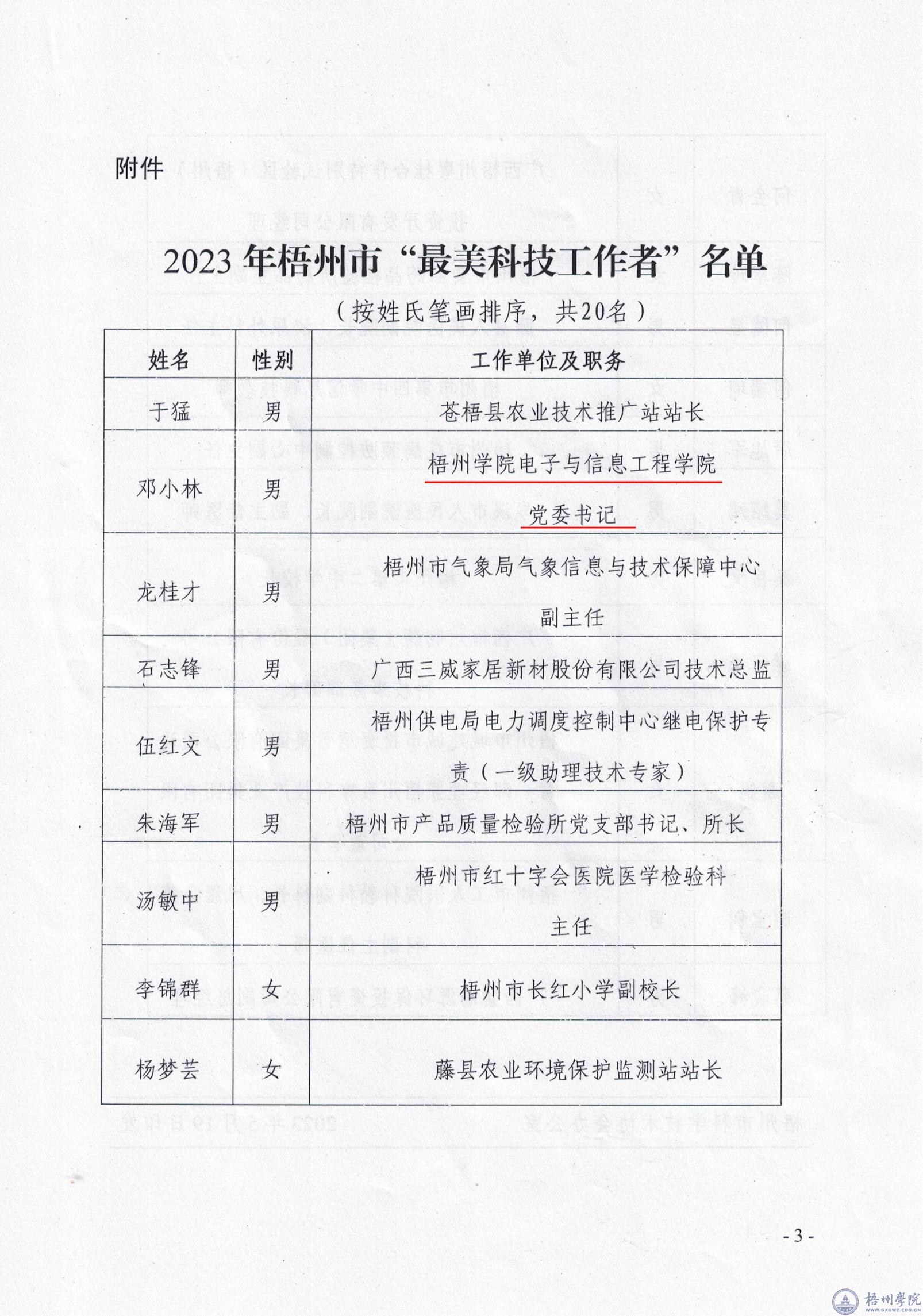 近日,梧州市科协等四部门公布2023年梧州市最美科技工作者名单,我校教师邓小林荣获“梧州市最美科技工作者”称号。