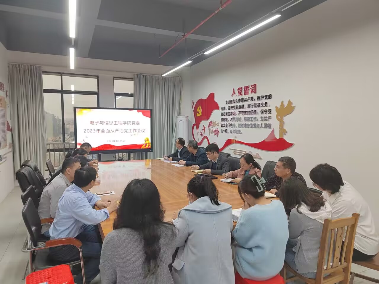4月11日,电子与信息工程学院党委在科技楼1204召开2023年全面从严治党工作会议。学院班子全体成员、党委委员、纪委委员、科级干部 、党支部书记、教研室主任等参加会议。