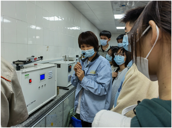 进入厂区之前,通过工程师的介绍,同学们了解了同润铜业的企业文化和历史沿革;生产车间内,同学们参观了整个生产流程,了解了生产工艺;最后进入质检部门,详细了解了质检过程和质检设备的使用,对相关行业背景和质检工作都有了一定的认识。