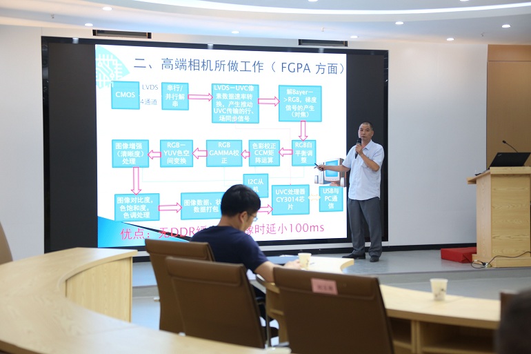 玉振明副校长围绕“颜色的基本理论”进行学术交流,深入浅出的讲授了色觉基本原理、色度学基本概念、颜色的表征、色彩校正等知识与原理,为自主研发的精细化工业相机色彩校正与产品升级提供了研究思路和技术参考。黄永庆老师以“精细化工业相机设计制造的若干问题”为题,展示了主持研发的精细化工业相机,从理论创新到技术实现的全过程,并分享了精细化工业相机研发过程中公关解决的若干项技术难题。郭慧老师介绍了在河道“四乱”问题中总结的科学问题,从复杂场景小样本数据集构建、自适应的目标检测与识别、精准视觉理解等方面提出了复杂场景的河道四乱问题的解决方案。最后,联合培养研究生黄家广同学汇报了在显微图像拼接方面的相关研究内容与进展。