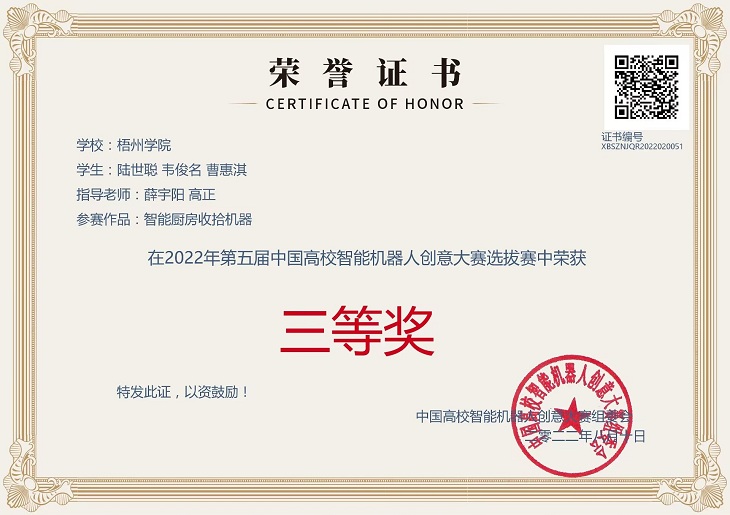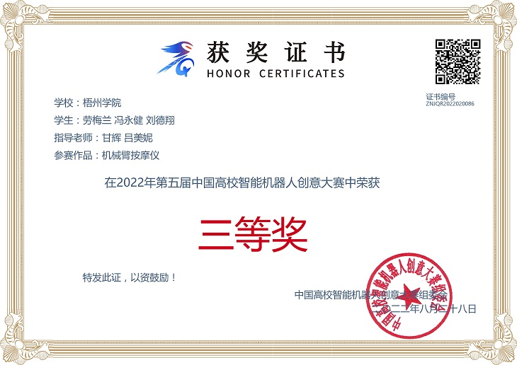 因疫情防控,本次大赛的选拔赛、决赛采用了线上举办方式。2022年8月29日,大赛正式落幕。本次大赛我校共派出5组队伍,历经选拔赛、决赛两个阶段,其中有两支队伍脱颖而出。其中,我校的甘辉、吕美妮教师指导,劳梅兰、冯永健、刘德翔同学的参赛作品“机器臂按摩仪”,历经第一阶段的广西赛区选拔赛和第二阶段的全国赛,最终勇夺全国三等奖。除此之外,薛宇阳、高正教师指导的陆世聪、韦俊名、曹惠淇同学小组作品“智能厨房收拾机器”获得广西赛区三等奖。