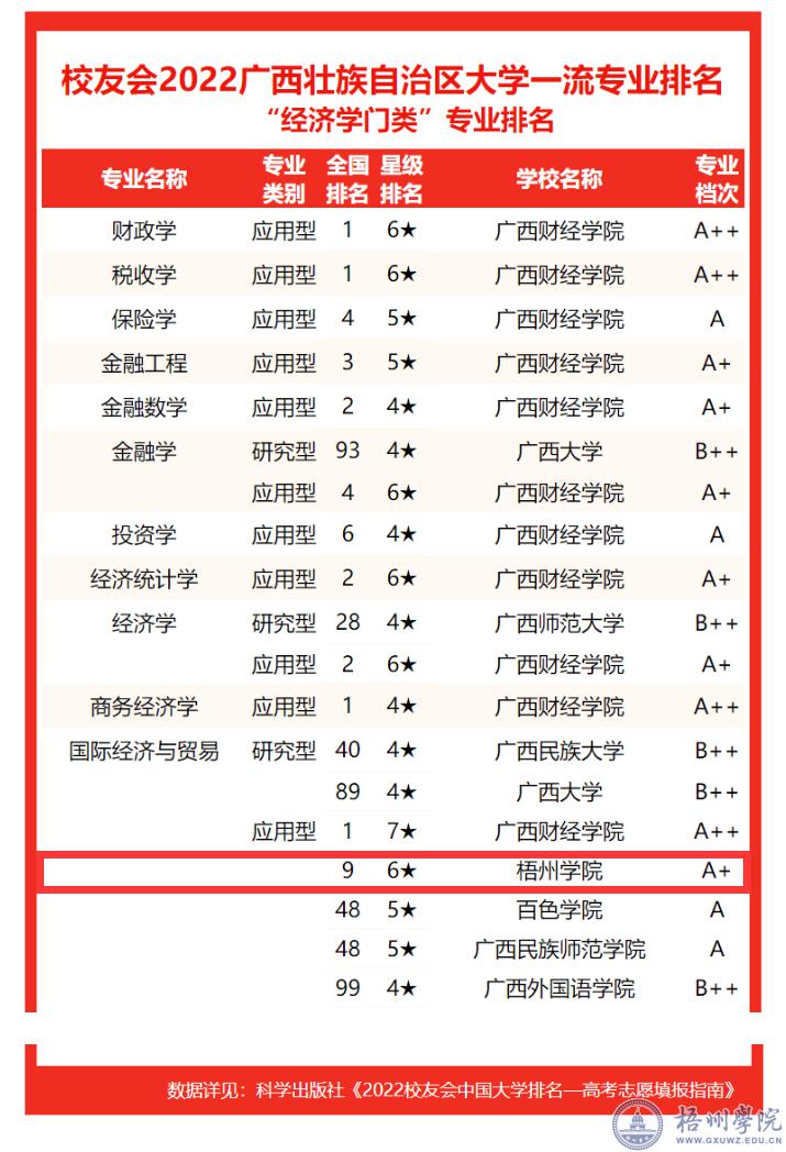 近日,全国第三方大学评价机构艾瑞深校友会网编撰、科学出版社出版发行的《2022校友会中国大学排名——高考志愿填报指南》发布了2022中国大学一流专业排名榜单,我校电子信息工程专业位列校友会2022中国大学电子信息工程专业(应用型)全国排名首位,星级排名六星,专业档次A++。我校国际经济与贸易专业(应用型)全国排名第9,星级排名六星,专业档次A+。
