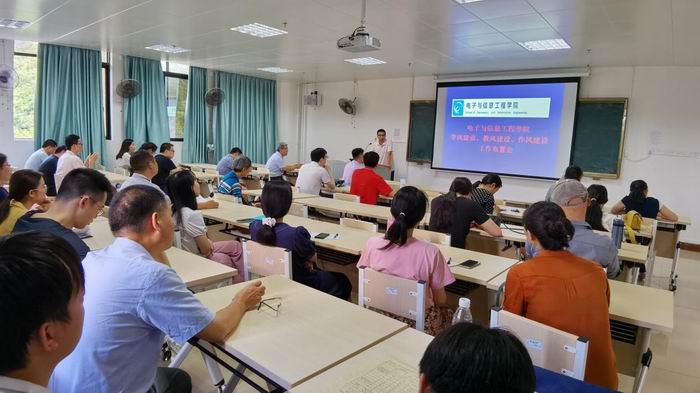 2021年6月9日,电子与信息工程学院召开全体教师会议,传达学习《梧州学院2021年“三风”建设年工作实施方案》,并结合学院实际,对深入贯彻学校开展“三风”建设年活动,正风肃纪,切实推进工作作风、教风、学风建设工作进行了进一步细化。学院要求全体教师充分认识“三风”建设的重要意义,把“三风”建设与党风政纪结合起来,以更加严谨认真的工作态度,求真务实的工作作风,投入到各项工作中;要以科室、教研室为单位认真研讨重点任务,找难点,补不足,让管理更精细,让教学更精致,让学风更清正。