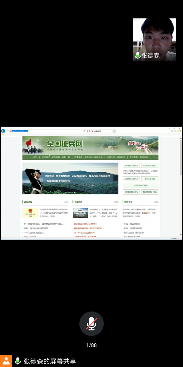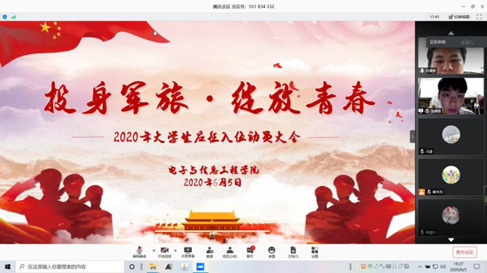 6月5日晚,电子与信息工程学院在腾讯会议APP举行以“投身军旅·绽放青春”为主题的大学生应征入伍动员会,学院党总支副书记陈兴、辅导员代表以及264名学生参加动员会。