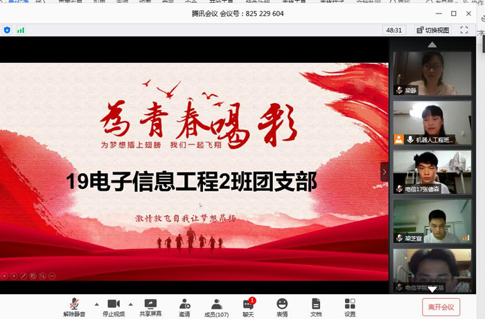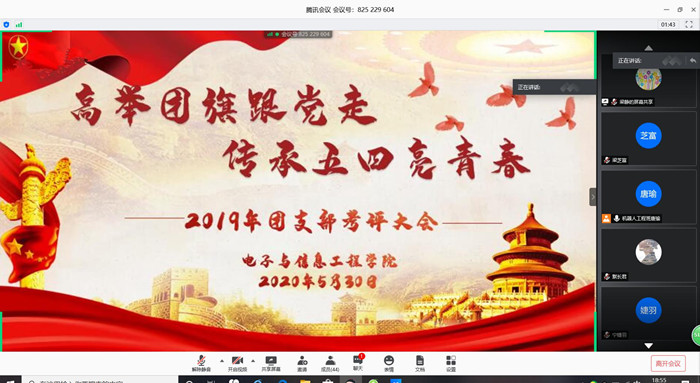 5月30日晚,电子与信息工程学院在腾讯会议APP举行“高举团旗跟党走 传承五四亮青春”团支部考评大会,学院党总支副书记陈兴、团委副书记梁静及辅导员们担任评委。