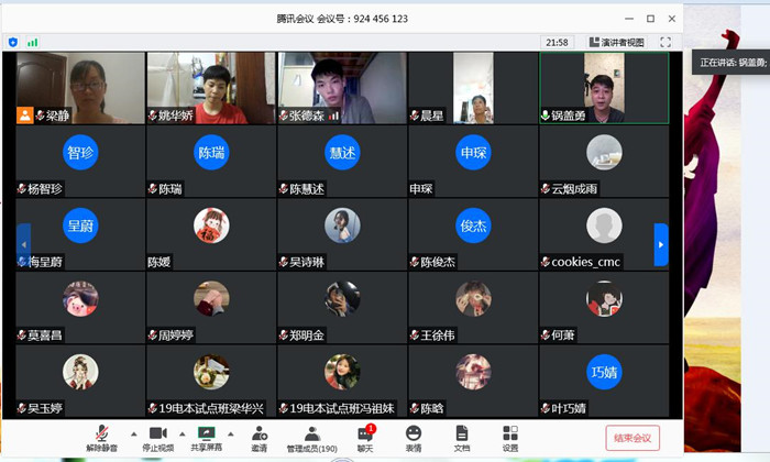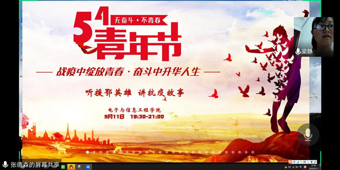 5月11日晚,电子与信息工程学院在腾讯会议APP开展“战疫中绽放青春·奋斗中升华人生”主题宣传教育活动,组织全体团学干部、团校培训班、青马培训班186名学生参加“听援鄂英雄,讲抗疫故事”分享会。