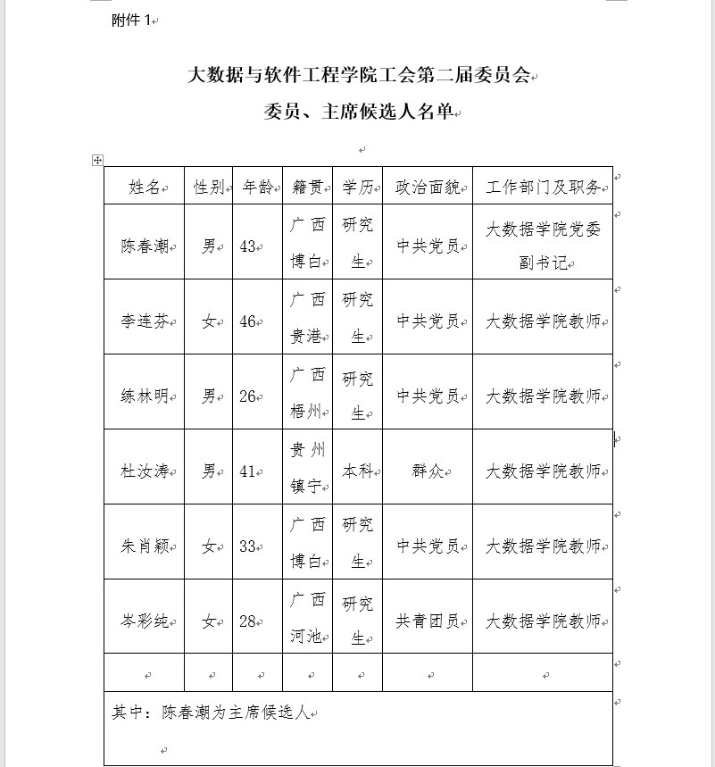 1、工会委员会委员、主席候选人名单