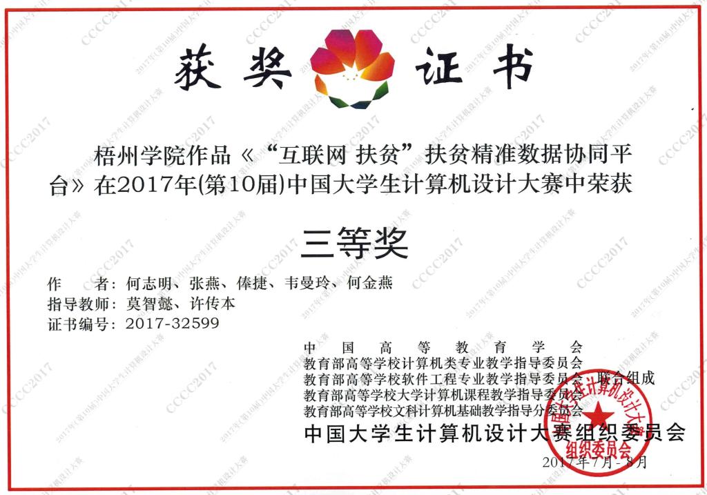 获奖学生姓名:何志明、张燕、俸捷 导师姓名:莫智懿、许传本