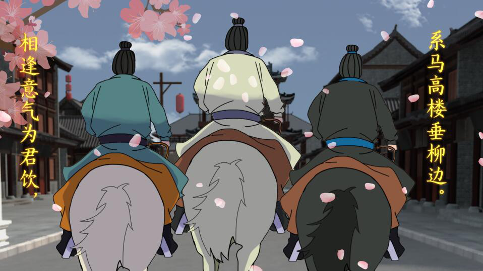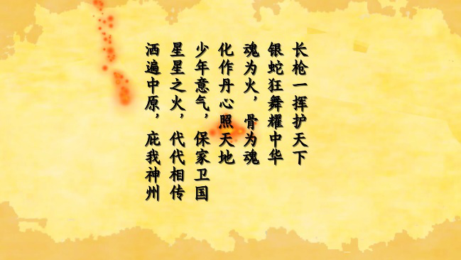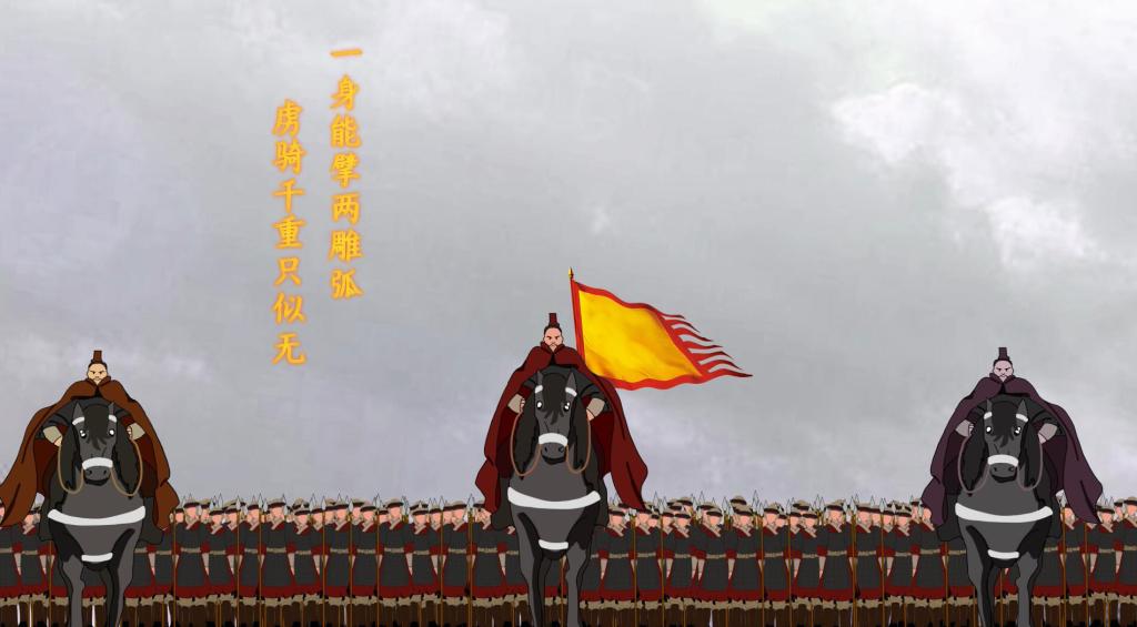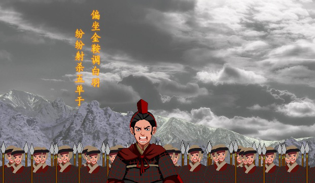 重点: 1.本作品首先使用AE制作片头,将由红色至金色做过渡转变,直截了当的告诉观众我们的标题。 2.在正片视频中使用手绘以及3D模型制作基本素材,使用红、黑、白、黄等中华文化传统用色,辅以其他颜色点缀。制作围绕著名战役的文案为时间轴,再通过二维动画以及各种视频特效辅助把诗词作为旁白与画面结合。 3.在片尾采用了直接点题和前后呼应的手法,通过小孩被将士们影响后又成了新一代将领转到直接用诗词独白进行点题,整个作品的主题最终由将士们杀敌保卫国家升华到中华民族不断继承的不畏艰险积极奉献的朝气和风貌。 4.在音频方面,使用一首背景音乐来配合故事情节发展,配乐使用台湾采风乐坊制作并演奏的国风纯乐曲。此曲运用了唢呐、二胡、竹笛等等传统乐器,曲风欢快激昂,把少年侠气的气概更明显的体现出来。也更加带动了观赏者观看时候的心情。 难点: 1.作品主题的升华。这首诗在感情方面前人已经做出了一个很好的诠释,但是与当代中华民族宣传的风貌结合还是稍有困难。作品团队在选题时,考虑到作品时间不能过长,又必须体现一个风貌传承又能让青少年感受热血沸腾的故事,最终团队确定了以漠北、河西、漠南之战为时间线,并在里面加入各种成语典故,最后利用诗句自白作为升华点题希望观众观看之余能学习到相关知识并感受到留取丹心照汗青的家国情怀。 2.作品团队采用卡通手绘的风格与参考promotion video的形式,为了就是更好的吸引年轻一代的观众,但promotion video大多数与歌曲宣传有关,如何将其与诗句结合是一个难点。作品团队经分析:在古代,诗句也是由伶人谱曲传唱并流传下来,只要配合音乐拍子,诗句便更加容易让人记住;另一方面,利用视觉效果结合画面,也达到了宣传诗词之美的效果。因此,确定了参考promotion video形式来讲述故事,巧妙的将现代媒体流行载体与传统诗词无缝融合。
