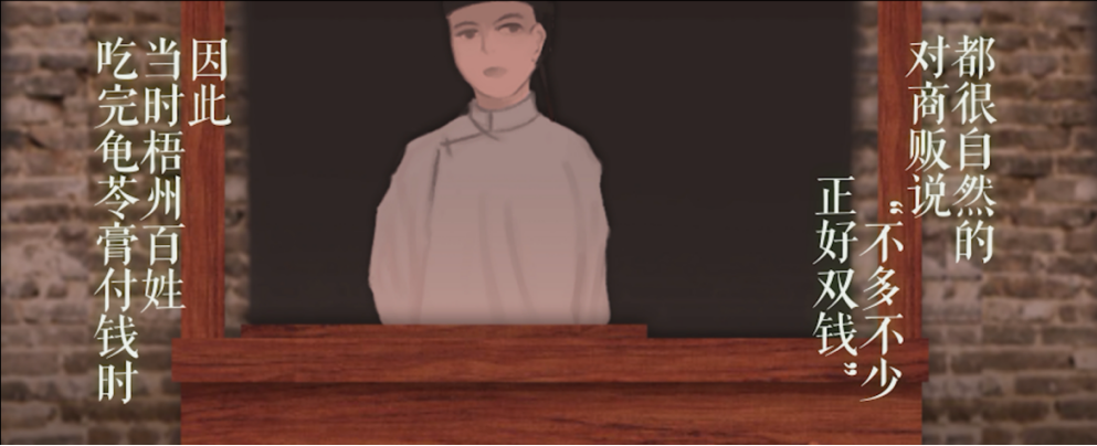 梧州龟苓膏,广西壮族自治区梧州市特产,是历史悠久的传统药膳,它作为梧州地理标志产品,很多人都不了解它的历史文化、人文以及梧州的风土人情。本作品通过以Adobe After Effects软件为主,以倒叙方式,由一碗龟苓膏,引出作品主题,接着介绍龟苓膏原材料。再通过身着宫廷服饰女子手端托盘,引出龟苓膏发源流传原因。从将士将军的动画剪影介绍龟苓膏民间传说。最后场景穿过街道聚焦到龟苓膏小摊。通过本次动画制作,人们更直观的了解龟苓膏历史文化和制作过程,加深了它在吃货心中的地位。并且让人们更想深入了解梧州这座拥有4000多年历史的古老城市。