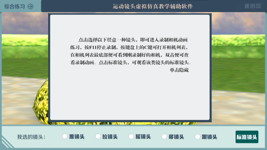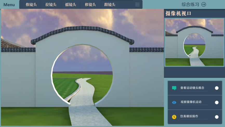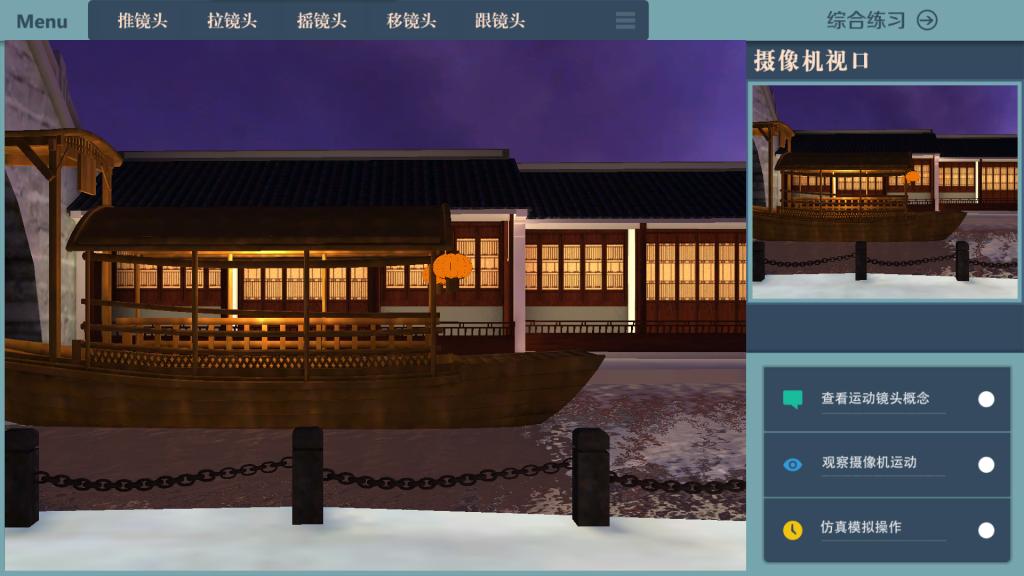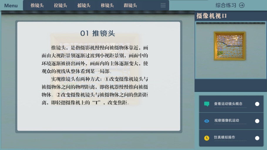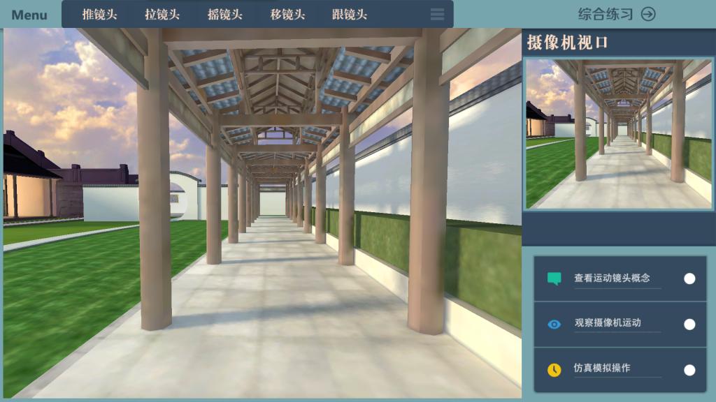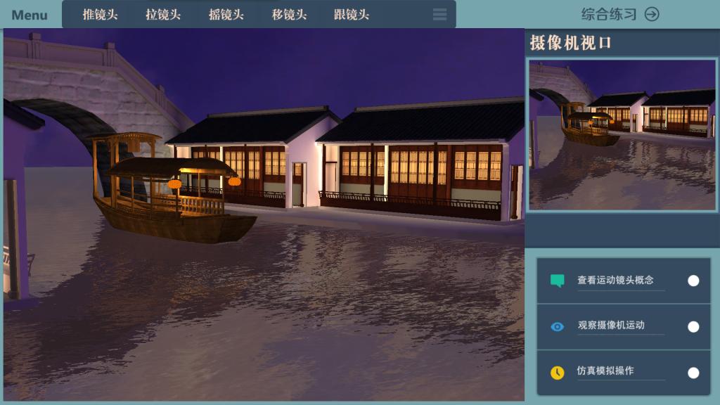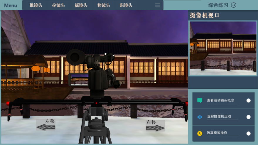 教学辅助软件,是老师们在教学活动中非常重要的辅助工具。在辅助软件的帮助下,以节约在黑板上板书的时间,提高教学效率,教学课件数字化,能有效实现教学信息化。 由于虚拟仿真三维教学辅助软件的一切场景都基于虚拟三维,这就解决了实验教学的场地问题,同时减少了实验设备的耗损,大大降低了实验教学的经济成本,有效的提高了实验教学的质量。因此,虚拟仿真三维教学辅助软件顺势而生。 先利用3ds Max搭建出影视摄影摄像实验教学需要的场景和摄像机模型,再运用Adobe Photoshop设计出美观大方的启动和操作等界面,其中操作界面由菜单栏、操作栏和综合练习构成,最后将打包好的模型和UI界面一起导入VRP-Builder2015,结合所学的虚拟仿真技术,制作出适合影视摄影摄像课程的五种基本镜头的辅助教学。