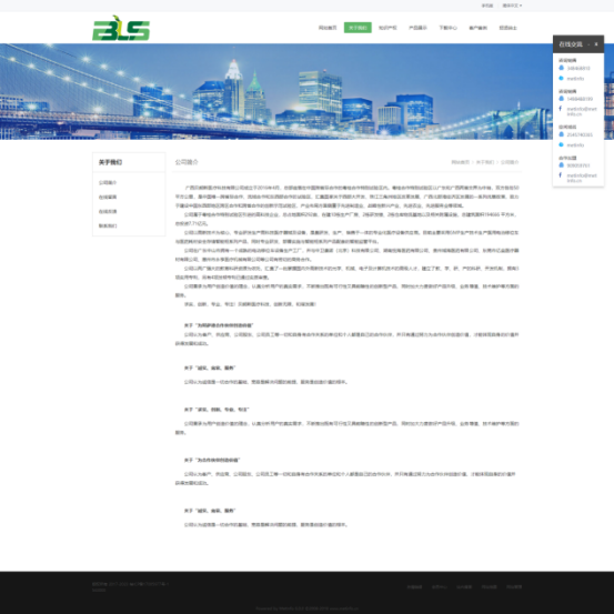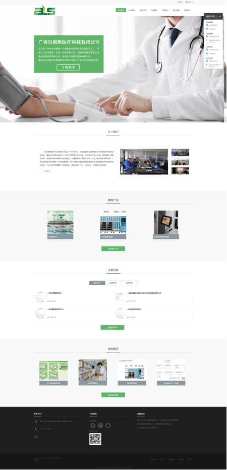 贝斯郎网站是宣传广西贝朗斯医疗科技有限公司,为梧州学院软件开发中心购买建站网站后,经二次开发,部署运行以供使用的网站。本网站主要面向医疗机构,为医疗机构推荐一些医疗器械,有意购买者可以在本网站上浏览商品、咨询详情。网站提供简体中文、繁体中文、英文三种语言,可随时切换,并且提供手机版,以供移动端随时浏览。网站页面简洁大方,栏目简洁明了,操作简便。