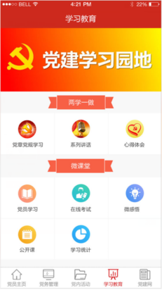平台利用互联网技术,一站式解决党务党建工作,包括组织建设、思想建设、作风建设、保持党员先进性教育活动和群众来信。组织建设包括了解支部的组织状况、管理和发展党员、划分小组、收取党费和办理转移党组关系;思想建设包括囊括多种形式的党员学习平台、主题宣传活动以及党员的思想汇报工作;作风建设包括监督反馈机制、处分工作流程以及考核评优等机制。进一步规范基层党组织组织生活制度,提高基层党员干部的理论水平和综合素质,增强基层党组织的凝聚力和战斗力。