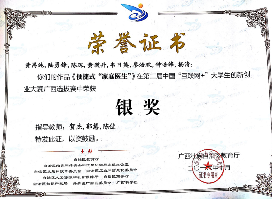 ”大学生创新创业大赛广西选拔赛区级银奖:便捷式“家庭医生”