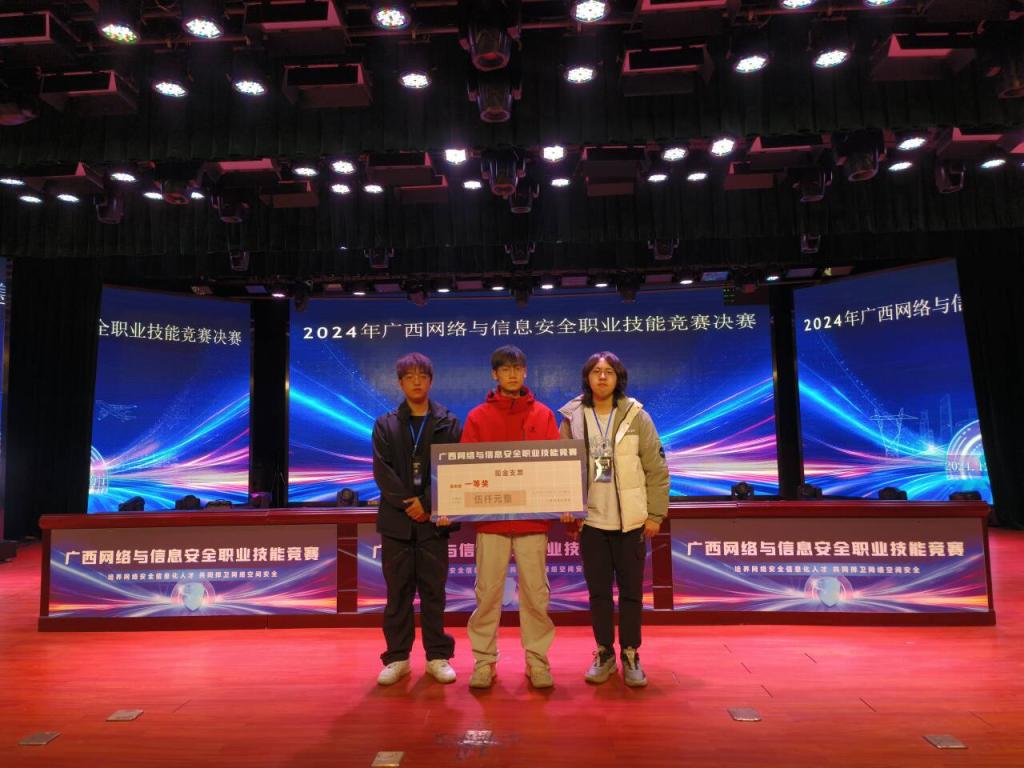 12月27日在南宁举办的2024年广西网络与信息安全职业技能竞赛决赛中,大数据与软件工程学院网络安全战队成员韦辉平、邱宗祺、黄俊杰同学代表学校参赛,战队的三位同学凭借出色的技术实力和团队协作,在大赛中脱颖而出,荣获一等奖。